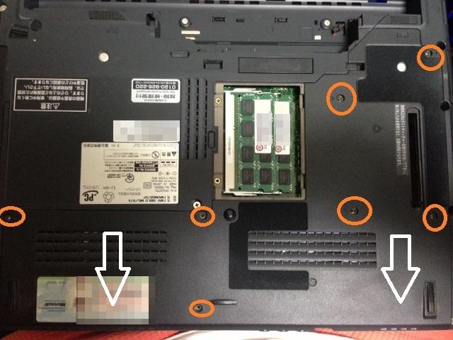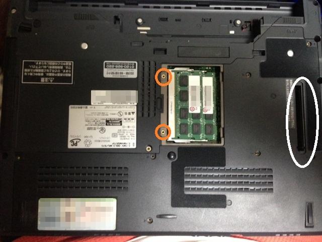 メモリがある場所のふたを外します。(オレンジで塗ってある部分)