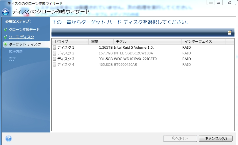 このソフトウエアは移行する側のHDDがソースディスクより容量が同じか以上でないと