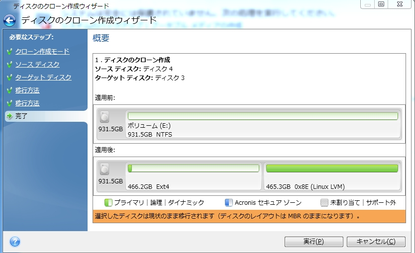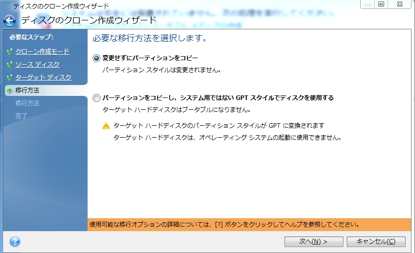 移行方法はまず変更せずにパーティションをコピーを選択しました。
