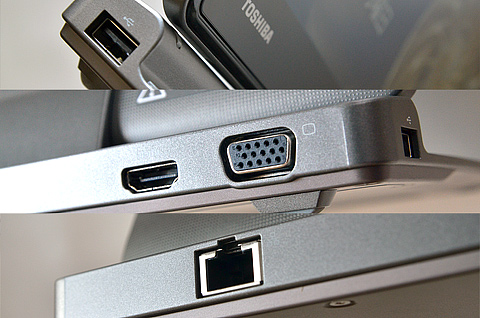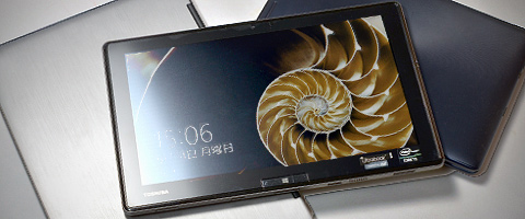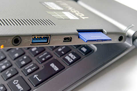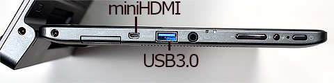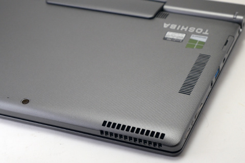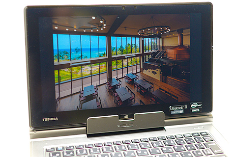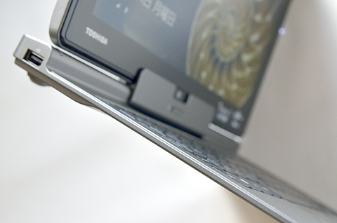 こちらのキーボード部にUSB2.0とHDMI、RGB D-subとギガビット対応LAN端子が備わっている。タブレットにせよウルトラブックにせよ、出張先での(プロジェクターやネットワークなど)接続などであらあらあらと慌てるハメになることが多いがそのへんはさすがに東芝さん。万全と言ってもいい装備ですね。