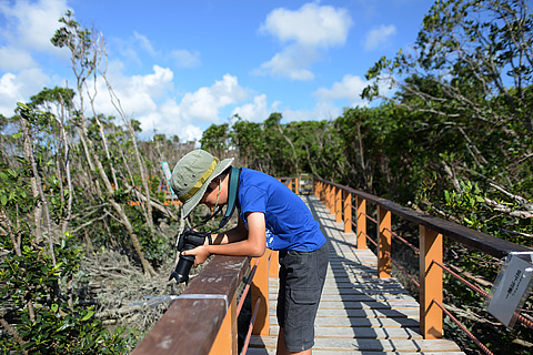 いつも見ているマングローブ林で何やら見たことがない生き物を見つけた!と大興奮の小学生w 一生懸命写真を撮っているが背面モニターではよくわからない。