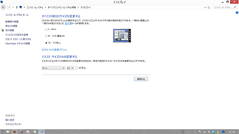 コントロールパネル→ディスプレイですべての項目のサイズを変更→150%。これで若干ながら老眼が入ってきてる目にもだいぶ使いやすくなった。さらにテキストサイズの大きさでメニューの文字サイズを大きくしてやったところ。