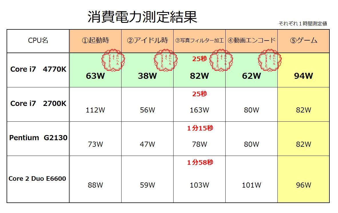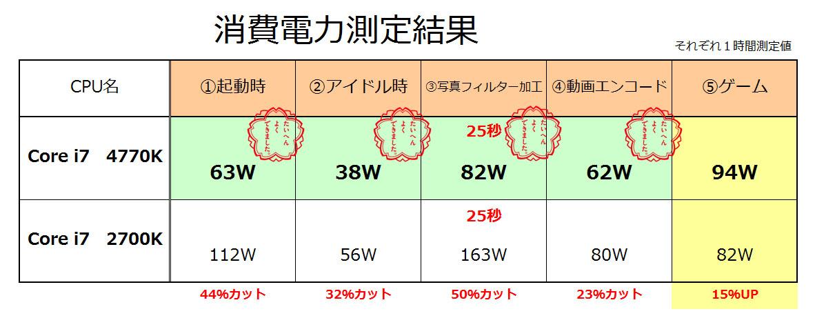測定結果は、レビュー中の不安をよそに、予想以上にCore i7-4770Kは省電力であることを証明してくれました。