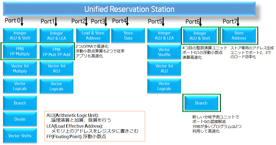 ポートとともに演算器も追加されています。演算器としてはFMAユニット、新拡張命令としてはAVX2とFMA3の二つになります。AVX2では整数の256bitベクトル演算命令を代表とした、ベクトル演算の増加、FMA3ではAVX2と同様のベクトル計算においてFMAと言う操作を1命令で行うようになっています。
