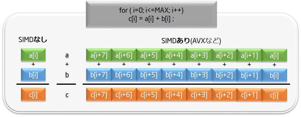 ちなみにインテルコンパイラーは今回やったような複雑な命令を書かなくても、勝手にAVX2対応のベクトル化をやってくれます。実際その方が速いことも多いので、プログラミングの専門家でなければ「自動ベクトル化」という機能を活用するだけで簡単にAVX2の恩恵を受けられます。