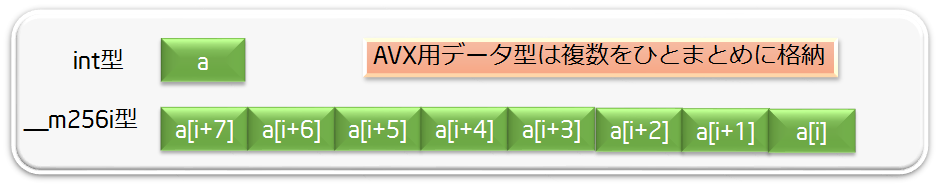 AVX2に対応したC++コードでは、整数型、浮動小数点型の数値を256bitひとまとめにしたデータ型を使います。