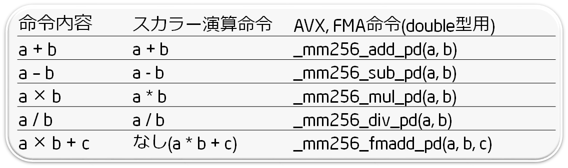 演算命令も専用のものになっており、長い名前の関数になっています。FMA3も一緒に書いています。下図はdouble型に対応する関数リストです。