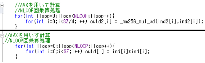 プログラムは1000要素の配列の要素の2乗を別の配列に入れていくものです。図はdouble型用のループ部分です。AVX型だと内側のループ回数が4分の1になっています。これは先ほどのとおり一回で複数要素を計算するためです。ind,outdが通常のスカラー配列、ind2、outd2がAVX型の配列です。