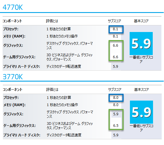 まずはエクスペリエンスインデックスです。グラフィックは内蔵グラフィックです。4770Kではプロセッサスコアが8.1となっており、着実に進化しているとわかります。グラフィックはデスクトップグラフィックス面での伸びが大きく、ひょっとしたら安いグラボより良いかもしれません。
