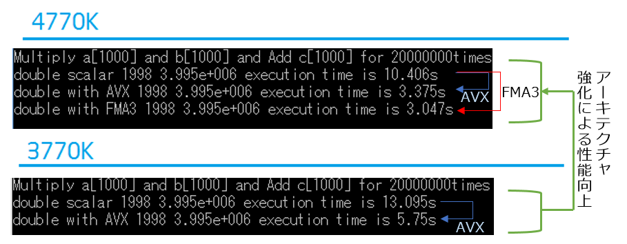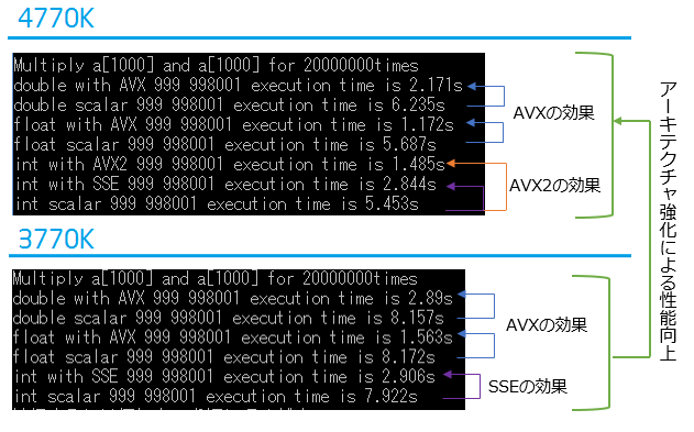 2行目以降が結果で、「with AVX」がAVXを利用、「scalar」がベクトル化しない計算、「with AVX2」がAVX2の整数演算です。AVX2は3770Kでは使えないので、3770Kにはありません。各行末が実行時間となります。
