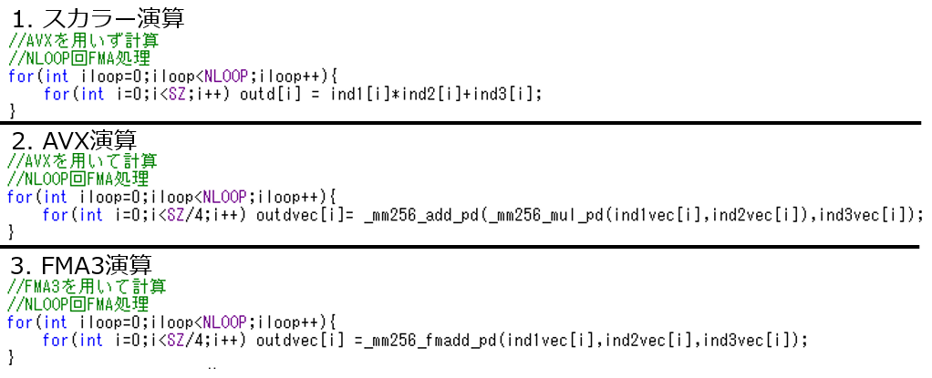 今回はFMA3でどれくらい高速化するかを見てみます。計算はdouble型で、1000要素の配列を3つ用意、a x b + cの計算を各要素で行うものです。スカラー、AVX、FMA3の3パターンでやってみます。