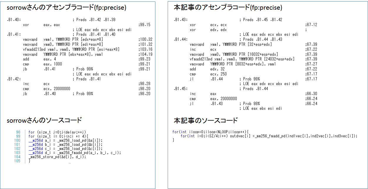 つぎにfp:preciseで比較すると、本記事のコードが10%以上遅くなっています。その差異の原因について二つのアセンブラコードを比較して考えてみました。(大きいので別窓で開いてください。)
