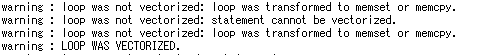 ベクトル化のレポート(下画像)をみると、これらの違いから、sorrowさんのコードではFMA、AVX2計算を繰り返すfor文がmemsetかmemcpyに変化できて、それにより高速化できているようです。