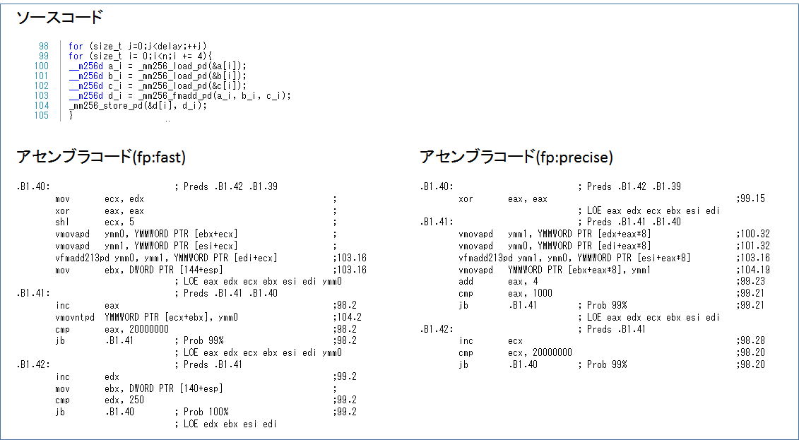 fp:fastだとfma命令を含むループが1回しか出てこないため、fp:preciseとそもそもやっていることが変わっているように思われます。