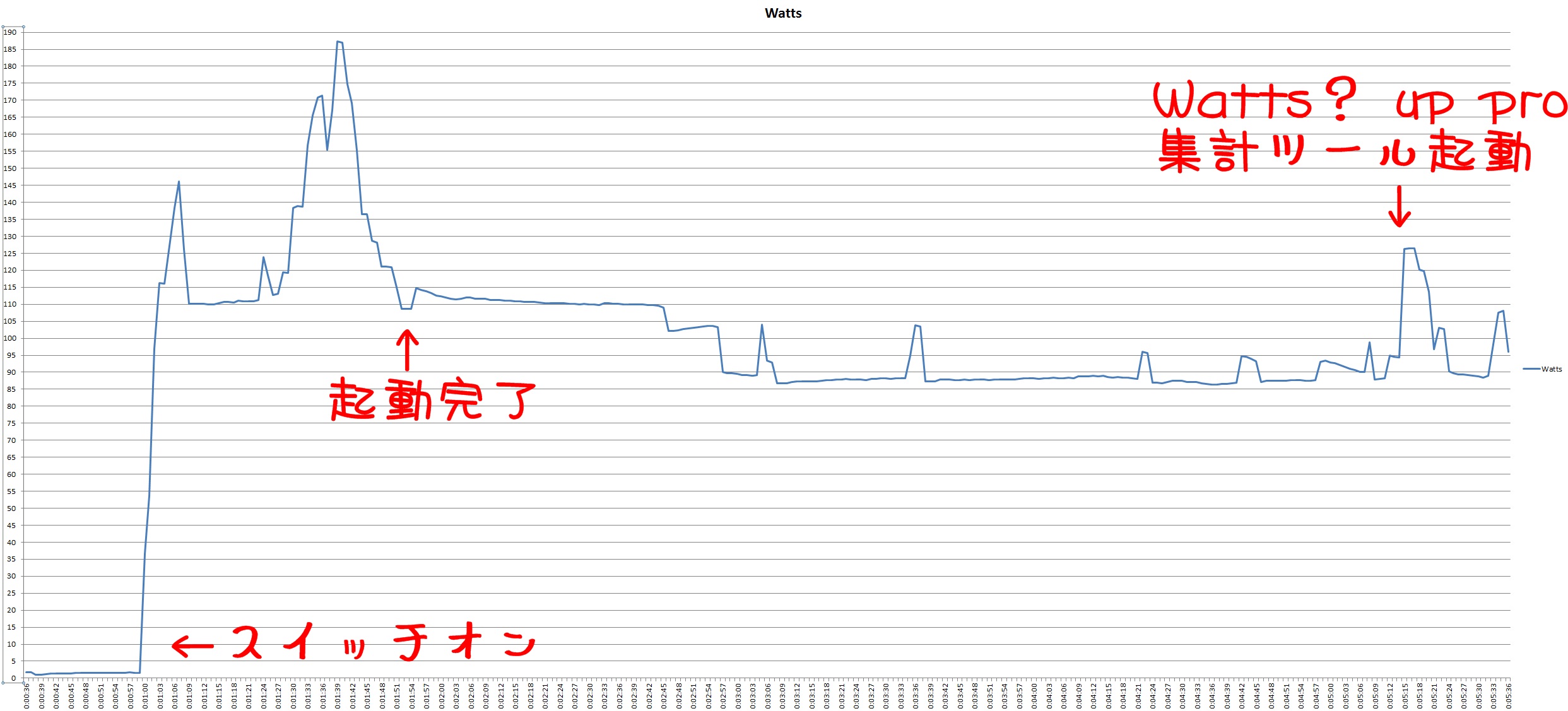 Watts up? PRO で起動から5分後まで一秒間隔で計測したグラフです