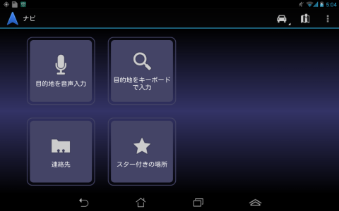 ナビのスタート画面はこんな感じで、目的地を指定して行くこともできますし、右上の左からも右からも2番目のアイコンを押せば、現在地を指し示すマップとしても使うことができます。