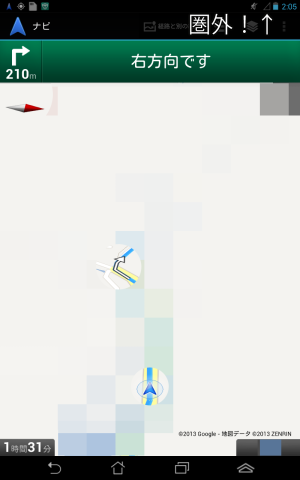 経路の再検索は行えないので、指示されている道を無視すると、圏外でも頑張って再検索しに行きます。