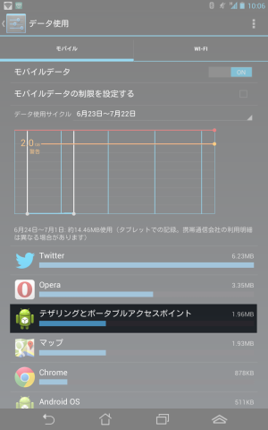 テザリングでの通信量は、「テザリングとポータブルアクセスポイント」という項目で表示されます。