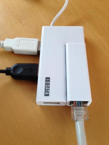 LANアダプター搭載USB 2.0へ LANケーブルとUSB機器を繋いだ様子