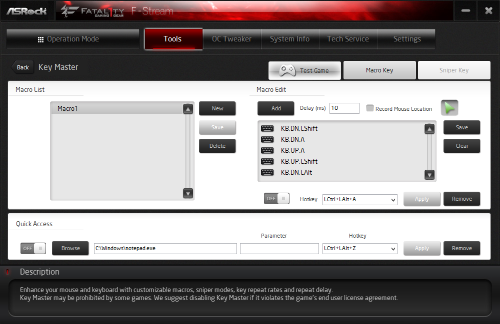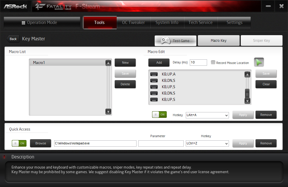すぐ下のQiuck Accessは、ショートカットキーで任意のアプリケーションを起動できます。Browseで起動するアプリケーションを選択し、Hotkey欄にショートカットを入れてApplyを押せば設定完了です。画面では、Ctrl+Alt+Zでメモ帳が起動するように設定しています。