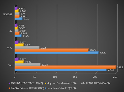 以下はCristalDiskMarkによる比較用USBメモリとの比較グラフです。(ブルーが本製品)