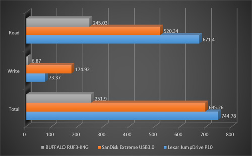 こちらは結果のスコアのみをグラフにしています。テスト容量の都合で本製品とSanDisk、BUFFALOの3機種の比較となっています。(ブルーが本製品)