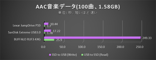 次に、音楽データとしてAACデータを100曲(合計約1.58GB)ほどランダムに用意して転送時間を計測しました。※グラフが短いほど速くなります。