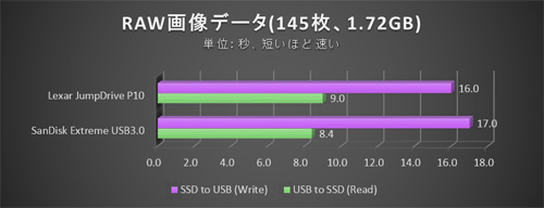RAW画像(145枚/1.72GB)を転送した場合は以下の通りでした。※グラフが短いほど速くなります。