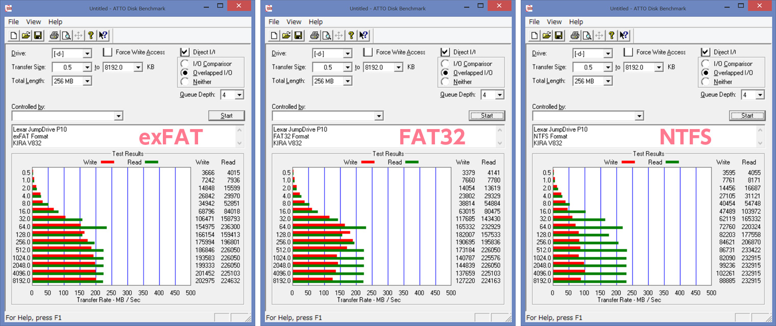 左から「exFAT」「FAT32」「NTFS」のテスト結果