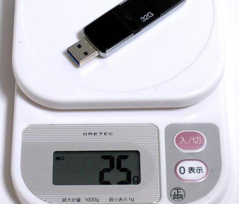 実際に重さを計ってみると他のUSBメモリに比べて2.5倍の重さの25gありました。