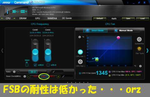 ただ、これだけではCPU性能が据え置きになってしまい面白くないので、OC Genie4が有効の状態からFSBを上げることで更なるOCを目指しました。