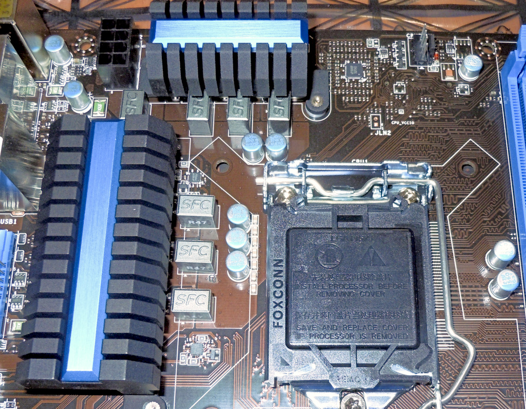 CPUの電源回路のヒートシンクがコンパクトで、PCHチップのヒートシンクもシンプルな構造なのが分かります。
