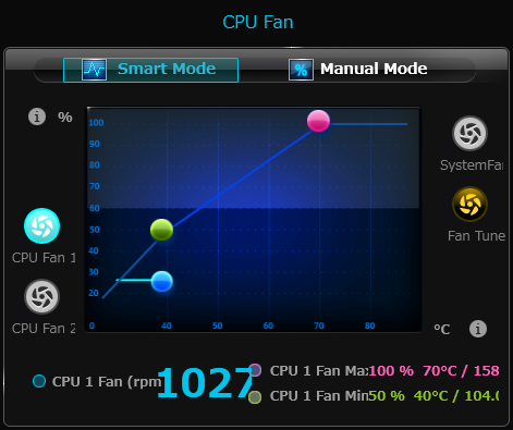 CPU Fanは 現在のファン回転数と、ファンの温度に対する回転数制御方法を設定できます。