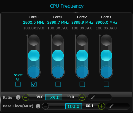 試した結果ですが、100 x40 設定という TB 3.9GHz から全コア 0.1GHzだけしか上がりませんでした。