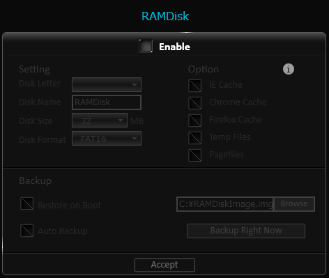 RAMディスクの設定です。ドライブ名、容量、名称、フォーマット(FAT16/32)と、