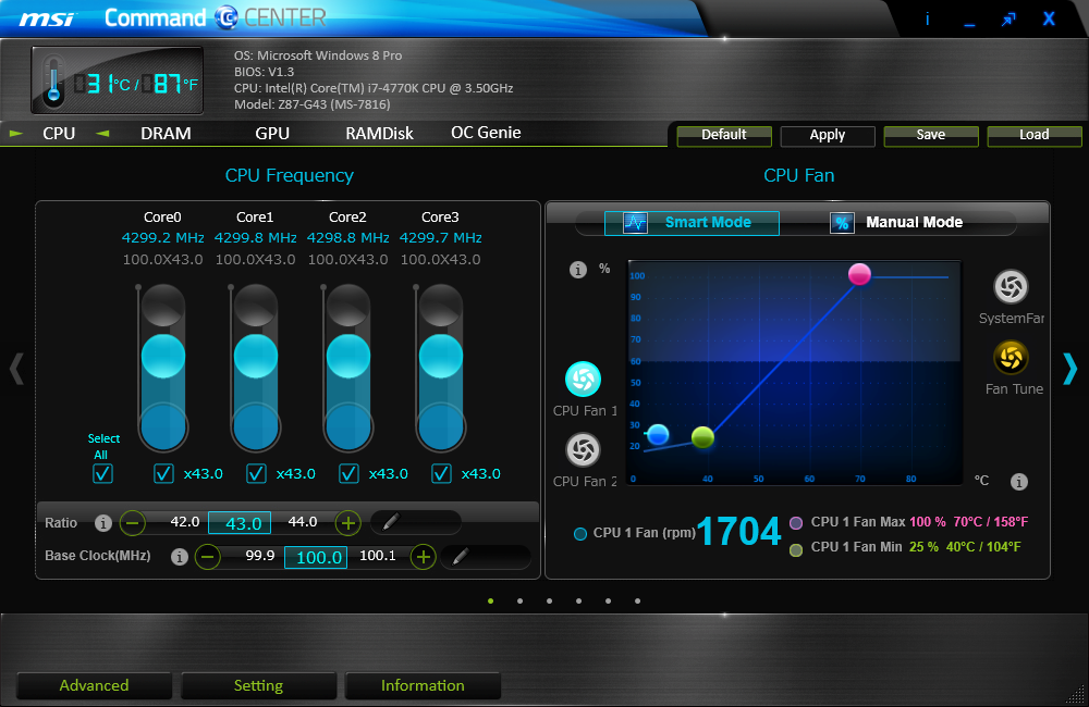 Click BIOS および Command CENTER の最後に現れる Z87-G43を含む MSIのZ87シリーズのOCシーケンス自動化機能が OC Genie 4です。