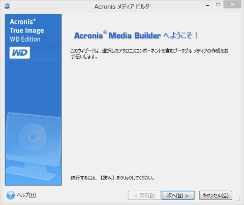 Acronis True Image WD Editionとあわせて同時にインストールされる”ブータブル メディア ビルダ(Acronis メディア ビルダ)”を起動します。”次へ”をクリック