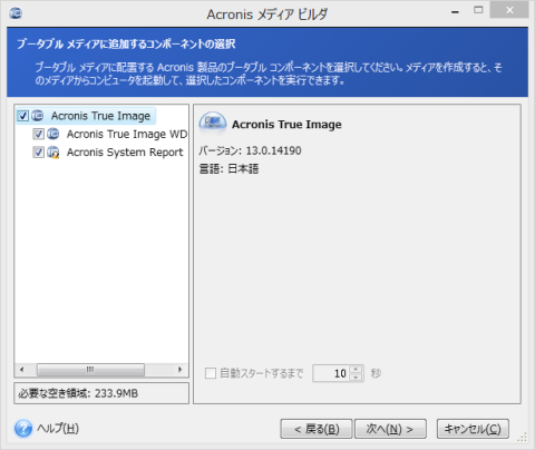 追加するコンポーネントの選択はAcronis True Imageにチェック(全てにチェックが入ります。)