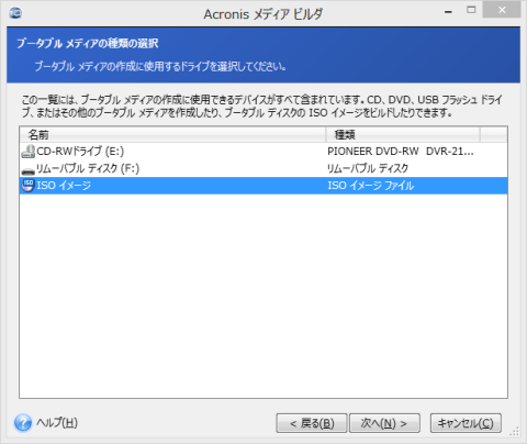 ブータブルメディアの種類は”CD-RWドライブ(CD-R/DVD-Rなど)、リムーバブルディスク、ISOイメージ”から好みの方式を選択して”次へ”をクリック。今回は汎用性の高いISOイメージを選択してみました。