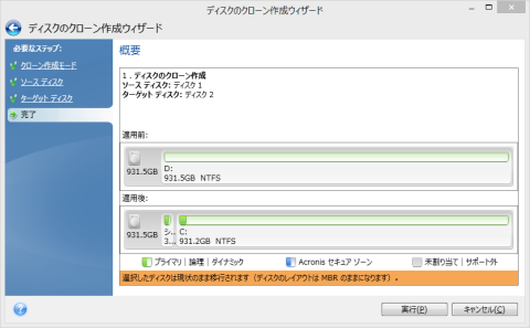概要が表示されます。自動を選択した場合、クローニング元のライブよりクローニング先のドライブの容量が大きい場合、残りの領域は1パーティションになるように設定されているようです。