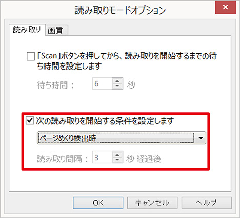"次の読み取りを開始する条件を設定します"のラジオボックスにチェックを入れて、"ページめくり検出時"を有効にします。