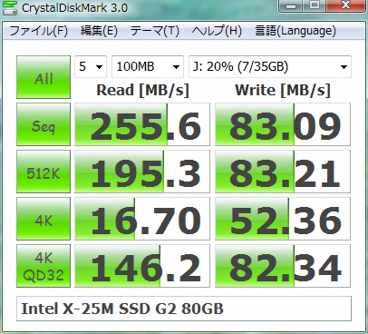 Intel X-25M SSD G2シリーズは評判も良く高速なのは知っていたのですが、ここまで変化があるとは思いませんでした。OSやアプリケーションの起動速度が格段に速くなっているのでかなり快適です。ベンチマークのスコア以上に体感速度の向上が大きいと感じました。