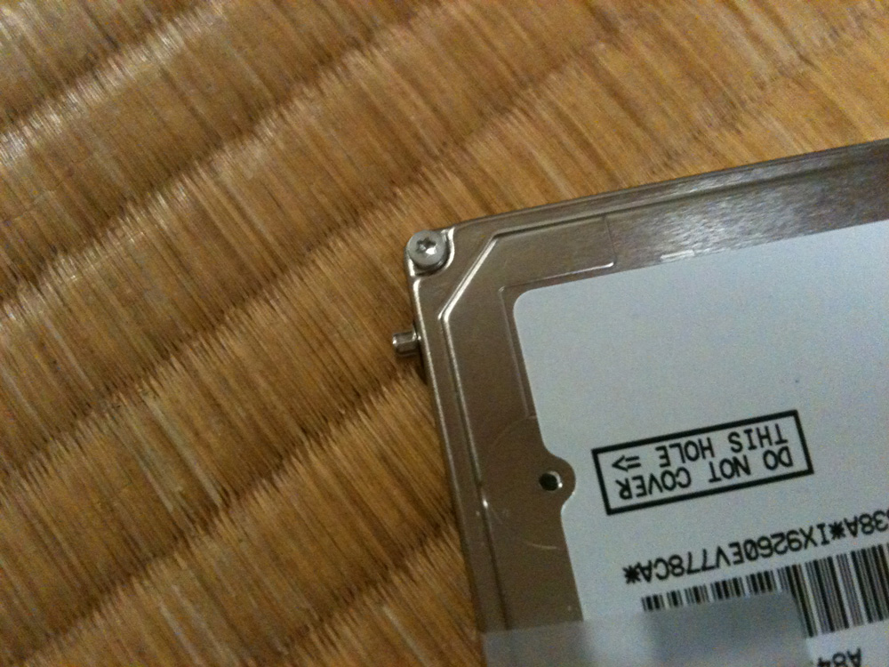 取り外したHDDの四隅についてる突起部分のネジを外す。(六角レンチ)