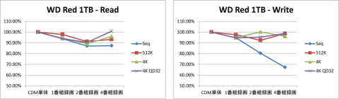 製品としての新しさのおかげなのか、WD Red の性能によるものなのか不明だが、WD Red の方が全体的に同時アクセスに対する性能低下は少ないというような結果。
