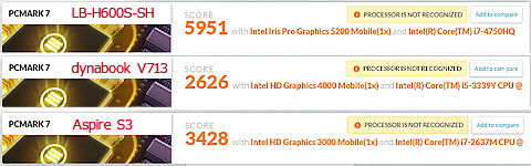 ちなみにPCMARK7でのスコアは以下。比較対象としてAspire S3とdynabook V713を使った。どれもSSDだしやはりIrisの威力が大きいのか…?というか、ウチのタワーより良いスコアだったりしますw