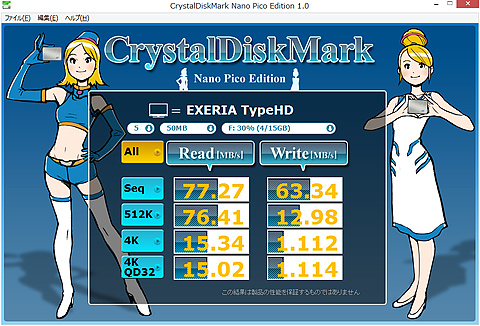 ウチでもっとも安定して速い緑EXERIAでこんな感じです。USB3.0カードリーダを超えてますね。