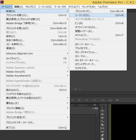 編集画面に入ったら、「ファイル」タブから「新規」、「シーケンス」を選ぶ。