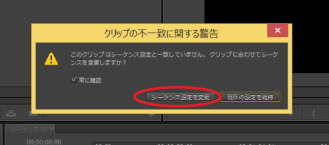 この時、先ほど設定したシーケンスが適当だったので素材とのシーケンスが一致していないので、この様な警告が出ます。