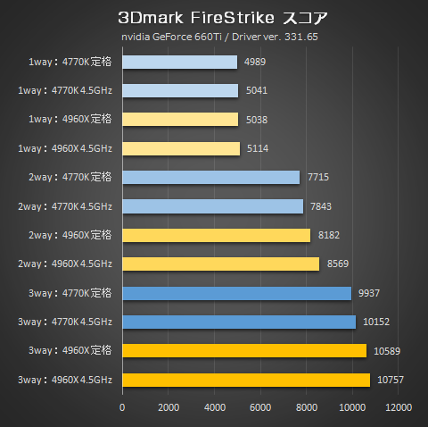 これはGraphicsのスコアは4960Xと4770Kでほぼ変わらないのに対し、CPU処理能力の差でPhysics Scoreに差が付いた結果となります。