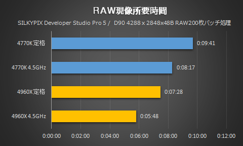 Core i7-4770Kの標準クロックだと、200枚の現像を終了するまでの所要時間は約10分弱となり、これが2000枚近い写真が詰まっているSDカード1枚分などとなると、それなりに時間がかかる処理となってきます。